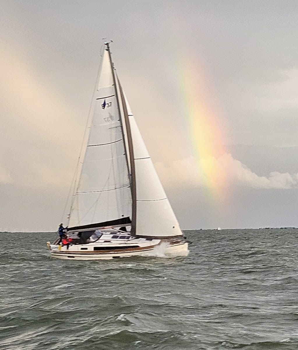 Die Herren waren zunächst zwar eher unbegeistert, aber so ließen wir den Abend an Deck noch gemütlich bei ein paar Bier ausklingen. Auch Sebastian konnte seine Liebe zu Gesellschaftsspielen entdecken (am nächsten Tag wollte er doch glatt noch eine Runde Wizard spielen). Nachdem Anna nun auch mit an Bord war, segelten wir am Donnerstag nach Enkhuizen, um dort gegen Mittag möglichen Gewitter- bzw. Regenschauern zu entgehen. Danach ging es weiter nach Lemmer, wo wir erst am späten Abend eintrafen. Während oben der Sonnenuntergang genossen werden konnte, spielte sich unten ein Spektakel der anderen Art ab. Nachdem das Curry zwei Tage zuvor wirklich lecker war, sollte es erneut Curry mit Reis zum Abendessen geben. Bei starker Krängung machten Benny und ich uns also an die Zubereitung und servierten den anderen den … bodenlosesten Reis, den sie je essen mussten. Wie das passiert ist? – Das bleibt besser ein Küchengeheimnis. Da wir für Freitagabend geplant hatten, die 24 Uurs bei Lelystad zu starten, ging es direkt nach dem Frühstück (naja irgendwie dann doch nicht ganz direkt) zurück nach Lelystad, um dort vor der Regatta nochmal zu tanken, duschen, kochen und einzukaufen. Da die Zeit schon knapp war, mussten wir den Motor anschmeißen und trafen dann an der Tankstelle in der Flevomarina auf die Gatica mit Jörg, Dag, Jan B., Jan F. und Nadja an Bord. Nachdem Mirco der Gatica einen kurzen Besuch abgestattet hatte, kommentierte er die Zubereitung unseres Nudelsalats für den morgigen Tag bloß mit ,,Also drüben riechts besser.‘‘… Spätestens als wir unsere letzte warme Mahlzeit für die nächsten 24 Stunden in Form von frischer Pizza an Bord hatten, sollte sich dieser Zustand jedoch geändert haben, wobei uns die neidischen Blicke der anderen nicht entgangen sind. Pünktlich geschleust starteten wir dann gemeinsam mit der Gatica an der Startlinie Lelystad-Zuid. An Wind mangelte es definitv nicht. Zwar gab es dieses Jahr keinen so tollen Sonnenuntergang, dafür bot sich uns ein großer Regenbogen und Wetterleuchten. Aufgrund des Gewitters blieben wir zunächst vorsichtshalber auf dem Markermeer, während die Gatica schon bald wieder übers Ijsselmeer bzw. sogar Wattenmeer segelte. Schnell wurde es dunkel, sodass es schon bald ans Ausschau halten nach anderen Schiffen ging. Die erste Schicht übernahmen Anna, Sebastian und ich bis gegen 4/5 Uhr Mirco, Benny und Randi das Steuer übernahmen. In den nächtlichen Stunden begleitete uns stets unser 70-90er Jahre Radiosender (dieses Jahr nichts mit Batteriesparen – Hauptsache das Radio kann laufen), während wir Tonne für Tonne rundeten. Zumindest der weibliche Part an Bord konnte sich dabei regelmäßig an den Klängen diverser ABBA-Songs erfreuen. Am Morgen trieb es uns wieder aufs Ijsselmeer, sodass wir die kurze Pause während des Schleusens zum Frühstücken nutzen konnten – der erste Morgen ohne vorzügliches (genau genommen gar kein) Rührei. Aufgrund des durchgehend recht starken Windes blieb unser Gennaker die gesamte Regatta über im Sack, für die anderen Tage hat er sich aber auf jeden Fall gelohnt. Auf dem Kurs zu einer der von uns anvisierten Tonnen ereignete sich ein Matchrace mit einem holländischen Boot, das uns über längere Zeit begleitete. Gegen 18 Uhr erreichten wir fast schon überpünktlich das Ziel vor Medemblik. Da die Onlineeintragungen unserer Tonnenrundungen bei uns leider nicht funktioniert hatten, machten sich Benny und Mirco auf ins Regattabüro, um unsere Daten in Papierform abzugeben. Nach ziemlich langer Zeit kehrten sie zurück mit einem ,,neuen‘‘ Onlinezugangscode, der gleichzeitig der alte war und nach wie vor nicht funktionierte. Also wurden wir Mädels nochmal rübergeschickt, in der Hoffnung mehr ausrichten zu können. Dieser Plan ging problemlos auf, bei uns gab es keine Widerworte bezüglich der Papierversion. In der Schlange vor dem Büro wurden wir angesprochen, ob wir die von der